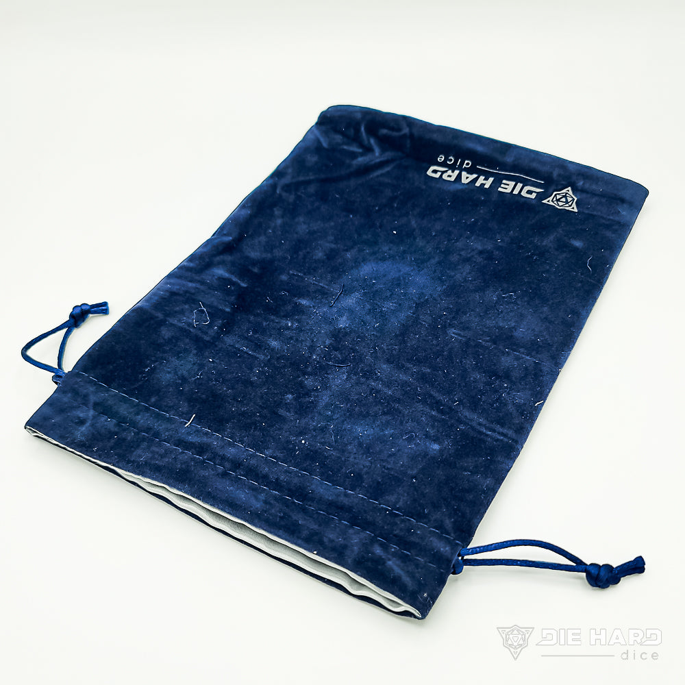 Our Extra Large Satin-Lined Velvet bag is 7" x 10" (17.5 x 25 cm), and can comfortably fit more than 25 sets of dice.