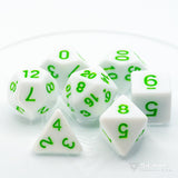 • Standard 7 piece RPG dice set in opaque white and inked in pastel green