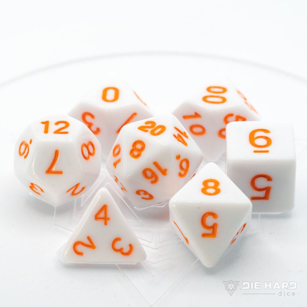 • Standard 7 piece RPG dice set in opaque white and inked in pastel orange
