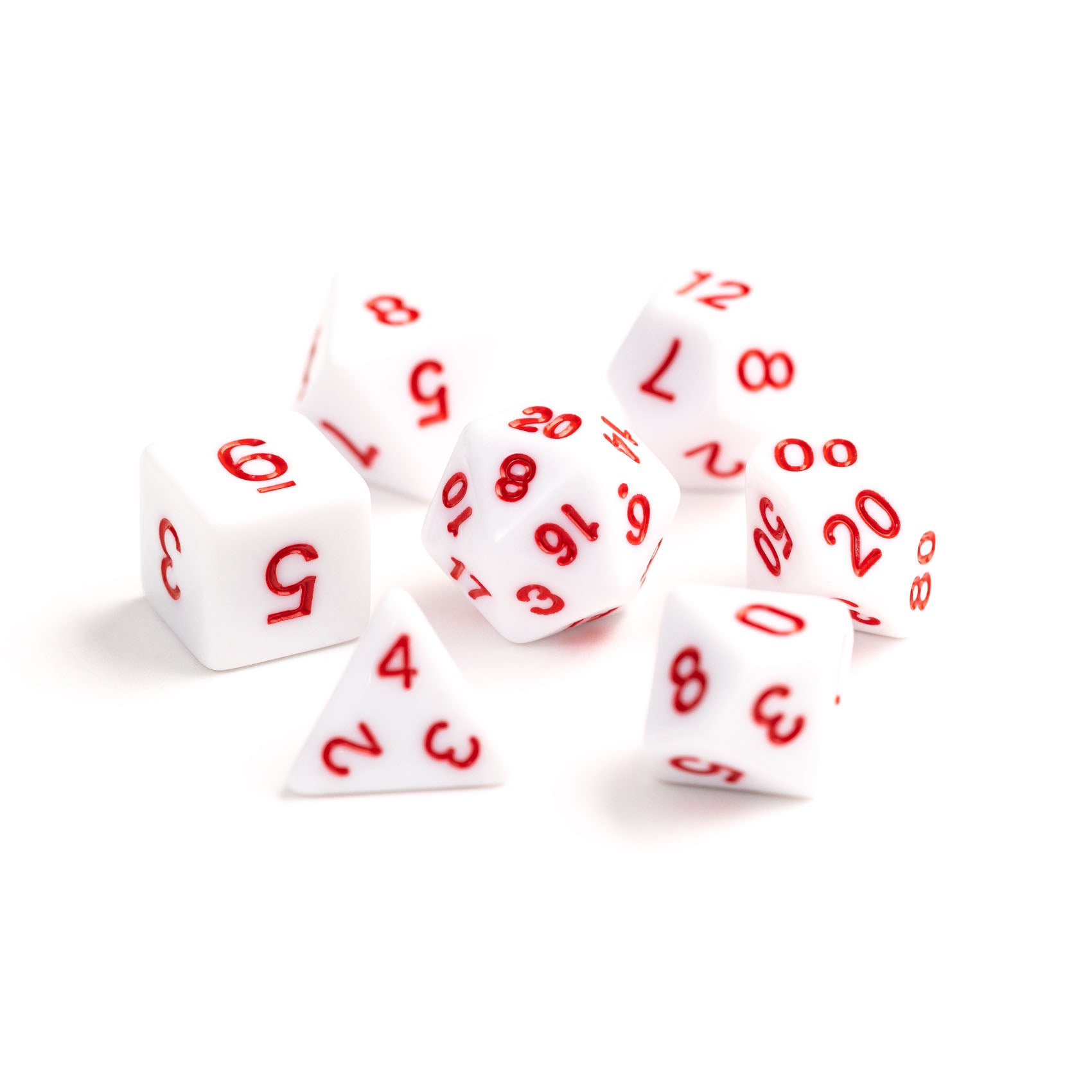 • Standard 7 piece RPG dice set in opaque white and inked in pastel red