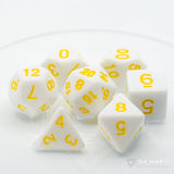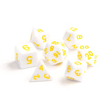 • Standard 7 piece RPG dice set in opaque white and inked in pastel yellow