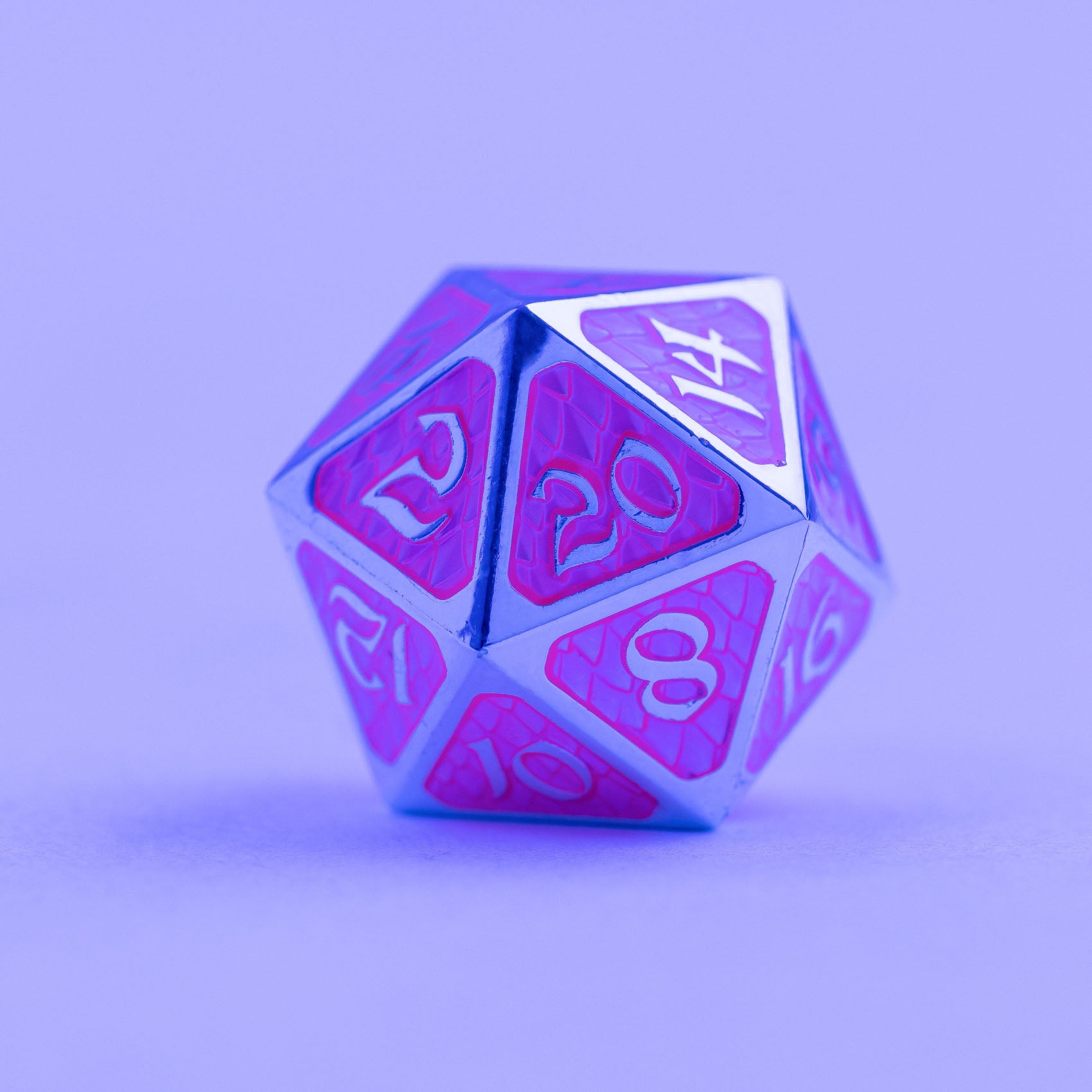 Silver plating with detailed dragonscale inlay in UV-reactive neon pink color