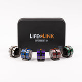 DISCLAIMER: These Prototype Life Counters are only interchangeable and compatible with other Experiment 194 products. Combining previously released wheels or bases with this product will result in sub-optimal feel and functionality. Each tin comes with all five main colors of LifeLink in matching plating to ensure that you can mix-and-match all of your favorite colors.