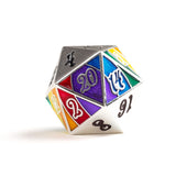 Introducing our Horizon Die! With a unique middle inlay filled with the shimmering colors of the rainbow, the top and bottom portions are inked in brown to more fully represent the Pride flag! Rainbow Horizon d20 is oversized like our dire d20s!